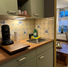 Unsere kleine Pantryküche ist für bis zu 6 Personen mit allem ausgestattet, was man braucht. Filterkaffe oder Senseo, Wasserkocher, Töpfe, Pfannen... alles da!